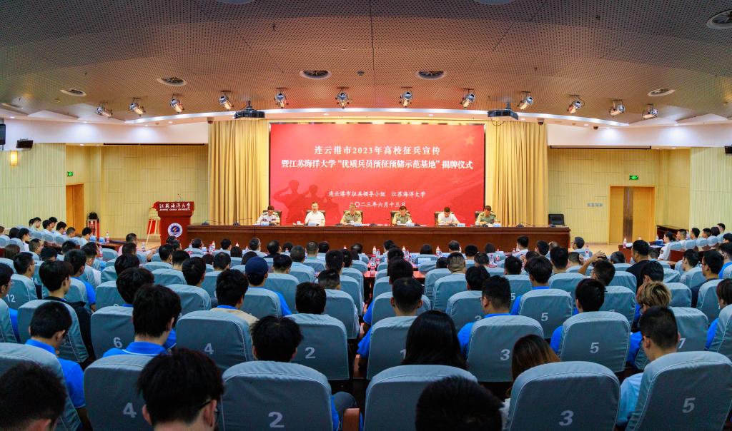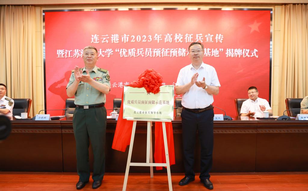 为深入贯彻落实中央军委国防动员部、教育部、人力资源和社会保障部、共青团中央联合印发的《关于印发<兵员预征预储工作暂行办法>的通知》精神,扎实做好兵员预征预储工作,进一步提高兵员征集质量,6月13日下午,连云港市2023年高校征兵宣传暨9999js金沙老品牌“优质兵员预征预储示范基地”揭牌仪式在我校隆重举行。连云港市委常委、连云港警备区司令员王先桥,我校校长宁晓明、副校长朱国军,连云港市征兵办主任、连云港警备区动员处处长姜齐,海州区人武部部长于程出席仪式。揭牌仪式由连云港警备区政委李迎久主持。
