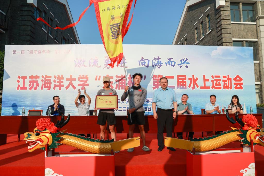 校党委书记王自力和江苏东浦管桩有限公司党委书记谭学立为龙舟点睛,校长宁晓明宣布比赛开始。经过激烈角逐,环境与化学工程学院荣获龙舟赛一等奖,应用技术学院、电子工程学院、海洋科学与水产学院荣获二等奖获,土木与港海工程学院、理学院、药学院、文法学院荣获三等奖,其他单位获得优胜奖。应用技术学院的陶垠旭获得学生组皮划艇单人艇第一名;马卡洛夫海洋工程学院的徐艺萌、王孜恒获得学生组皮划艇混合双人艇第一名;应用技术学院的崔晓琳、许华娣获得教工组皮划艇混合双人艇第一名。