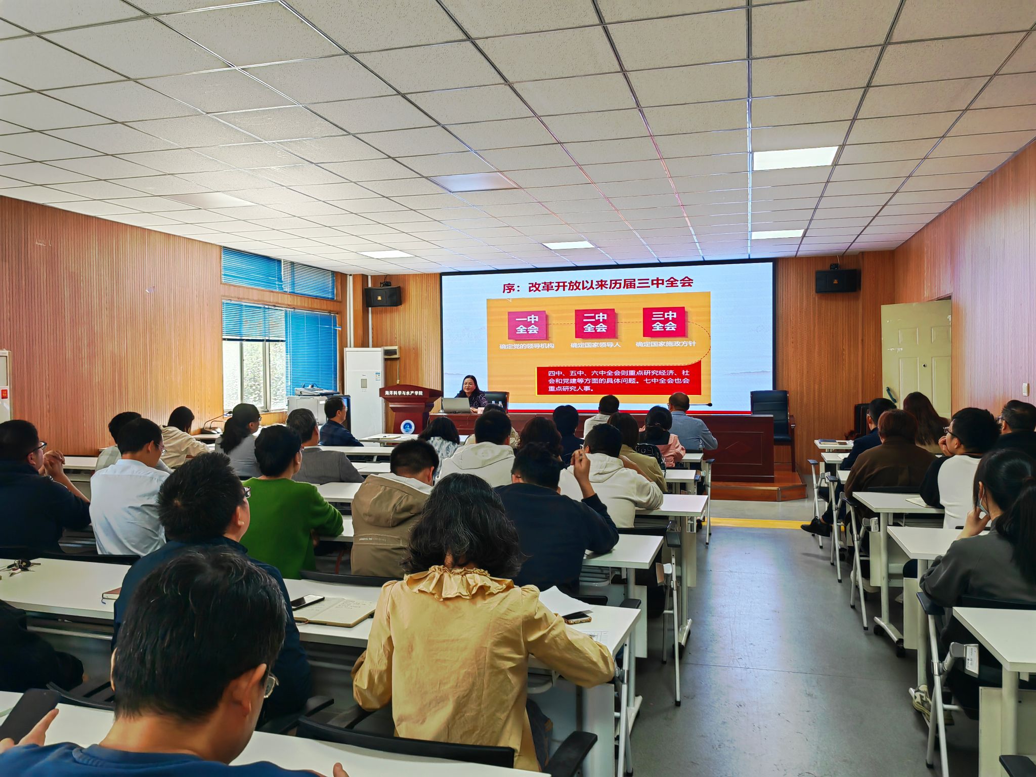 为深入学习领会党的二十届三中全会精神,努力把握其思想精髓、核心要义和实践要求,做到学深学透、入脑入心,10月9日下午,校宣讲团成员、马克思主义学院院长沈春梅为全体教职工作专题宣讲,学院党委书记黄金虎主持报告会。